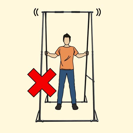 Answer: You can perform these actions after do some necessary protection methods (for safety) such as: put heavy things on the legs of KT folding stand frame (example, 4 sand bags, total weight each side is heavier than your body weight), ask 2 people to hold the legs, or drill and screw the legs to the ground… Because KT folding stand frames are placed on the floor without being fixed to the ground, and have lightweight structure (for easy moving, folding) so if you don’t do the protection methods but still perform these actions, it may be dangerous for you (the legs can be lifted off the ground and the KT folding stand frame may topple over).